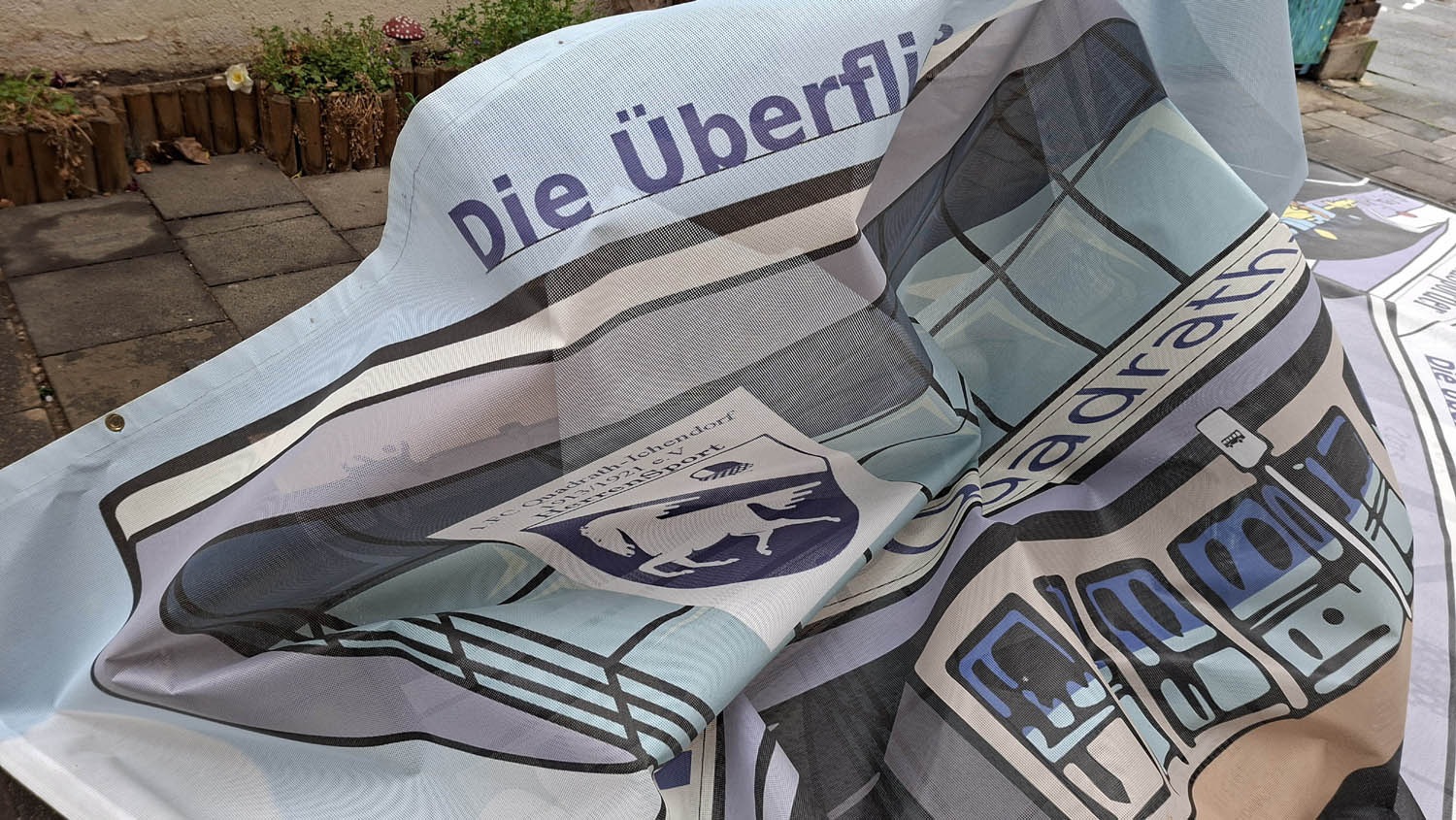 Wie bei einem modernen Gemälde war zunächst nicht klar, wo bei der Plane oben und vorne, hinten und links war. Da trat einer der Drei mit Führungseigenschaften ausgestattet hervor und schlug vor, die Plane auf dem Erdboden auszubreiten und den Wagen darauf zu stellen.