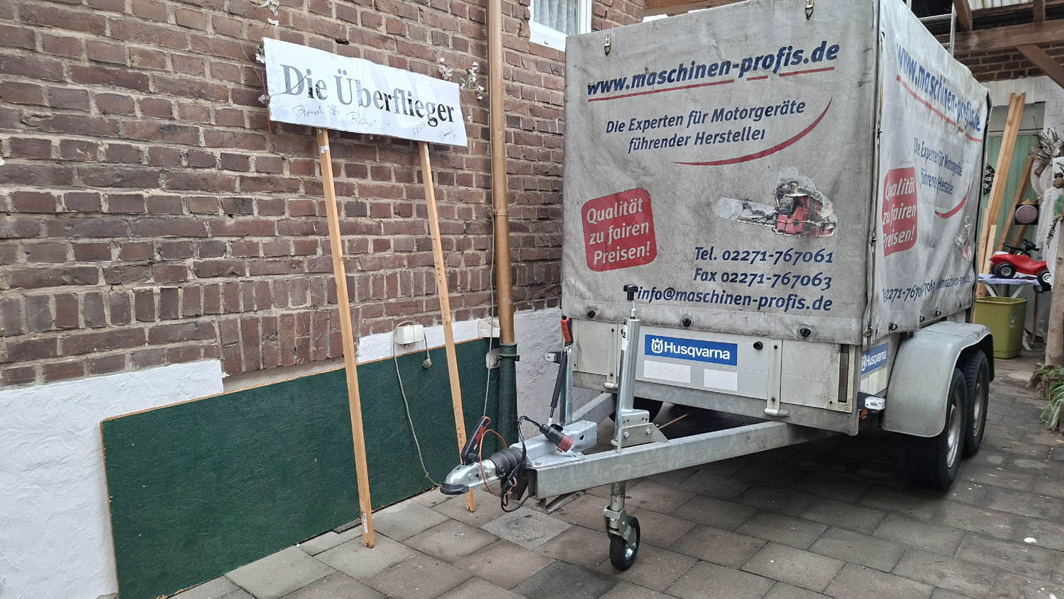 Darüberhin wurde es Zeit für einen Kaffee oder ein Wasser. Auf diese Weise frisch gestärkt, fand das Trio zu einer Anordnung der Plane, die ein Gestell erforderte, denn, und darin waren sich alle Drei einig, ein Siemens-Lufthaken erschien nicht auszureichen. Also stöberten die Drei in der Gegend umher und trugen Holzstangen zusammen, aus denen ein Gestell gebastelt werden sollte.