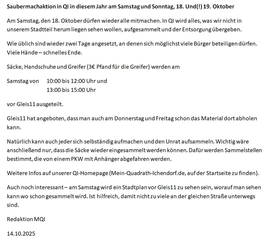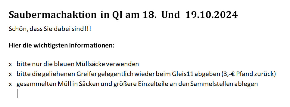 Wer schon lange in QI lebt und am Sonntagabend im Ort unterwegs war, der hat bestimmt gedacht "Hier müssen aber viele Leute gesammelt haben." Es lag kaum etwas umher, was in die Tonne gehört.