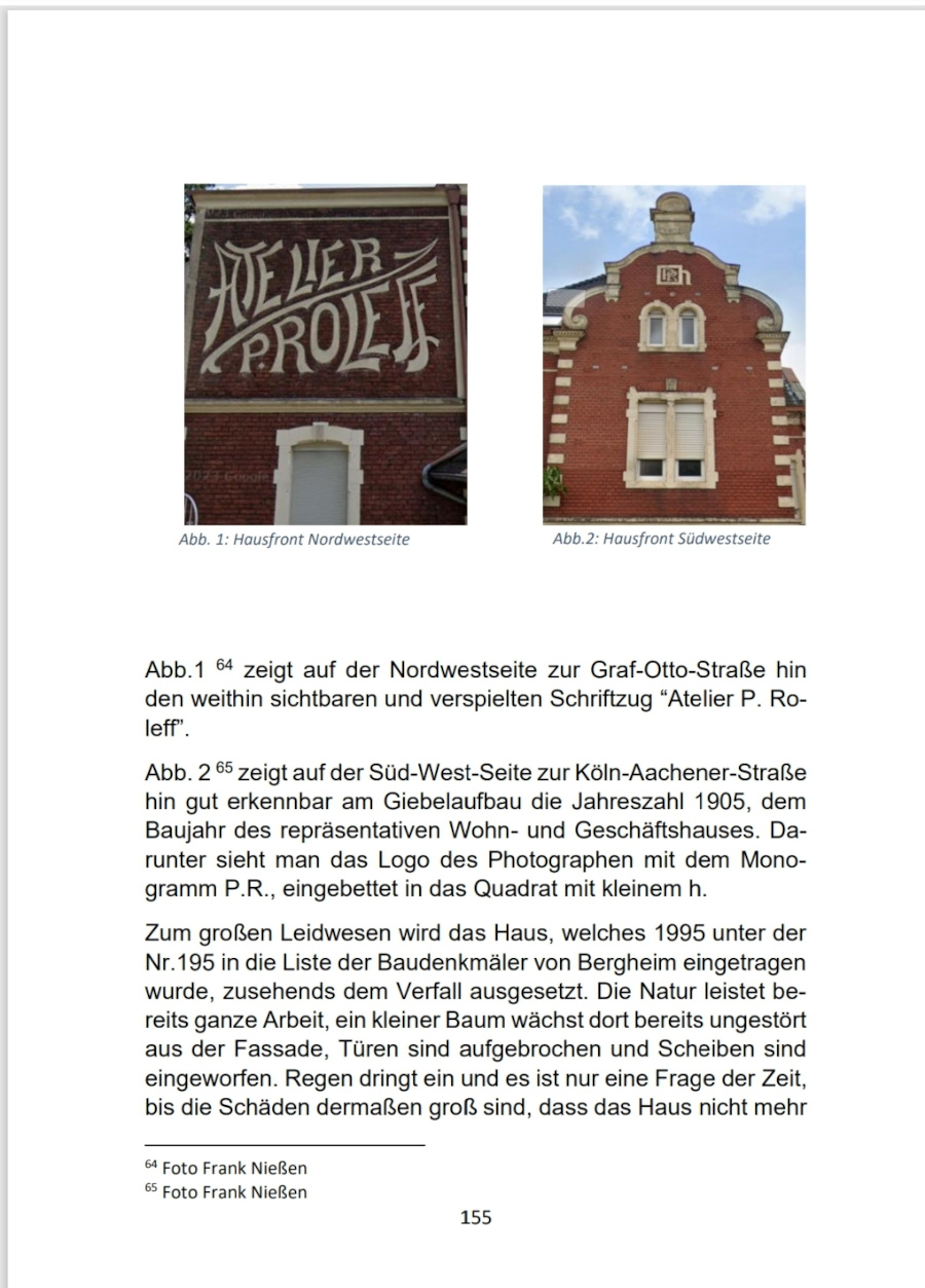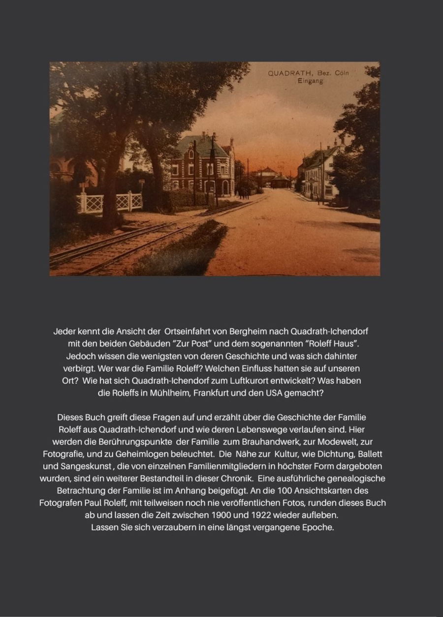 Einen besonderen Platz nehmen Bilder der über 100 Ansichtskarten des Quadrather Fotografen Paul Roleff, einem Pionier der Fotografie, aus den Jahren 1902-1922 ein. Diese wurden erstmalig aus mehreren Archiven zusammengetragen und in diesem Buch vereint. Es gibt hier Ansichten von Gebäuden und Industrielandschaften des Altkreises Bergheim und darüber hinaus. Teilweise sind die Bauwerke der Stadtmodernisierung, den Weltkriegen oder der Braunkohleförderung zum Opfer gefallen und nicht mehr vorhanden.